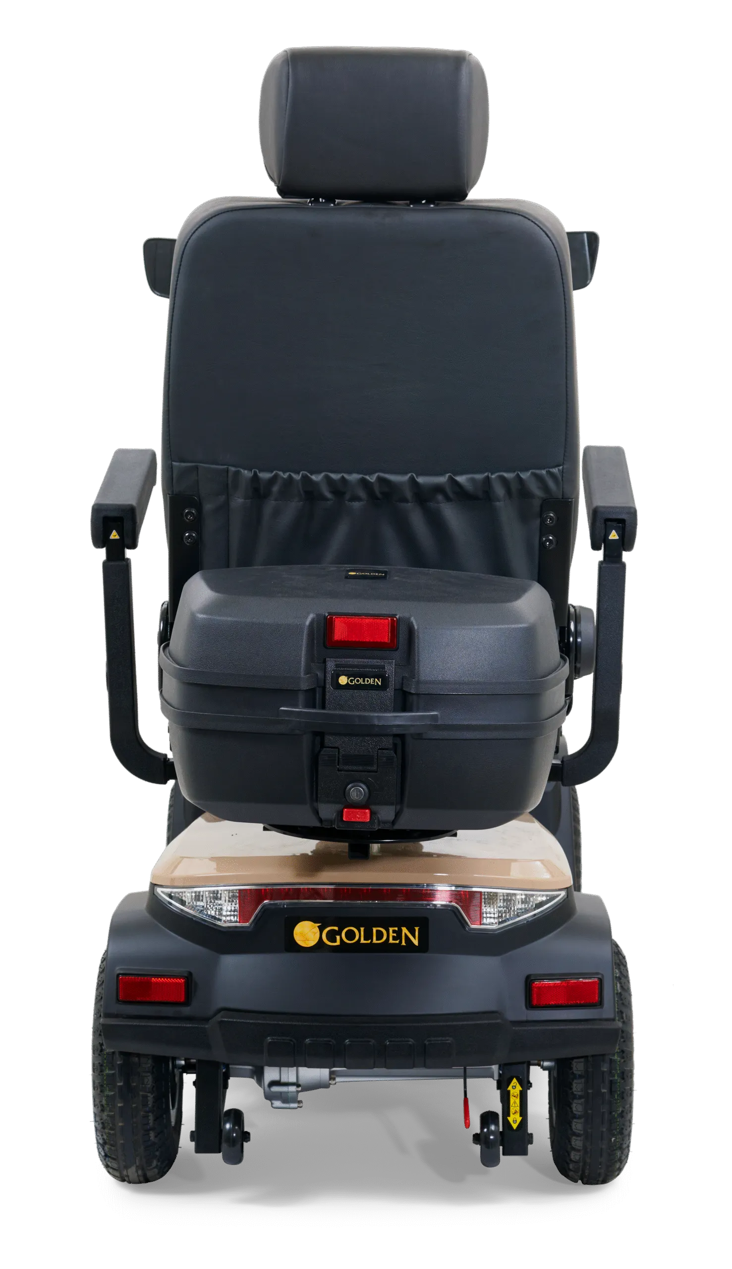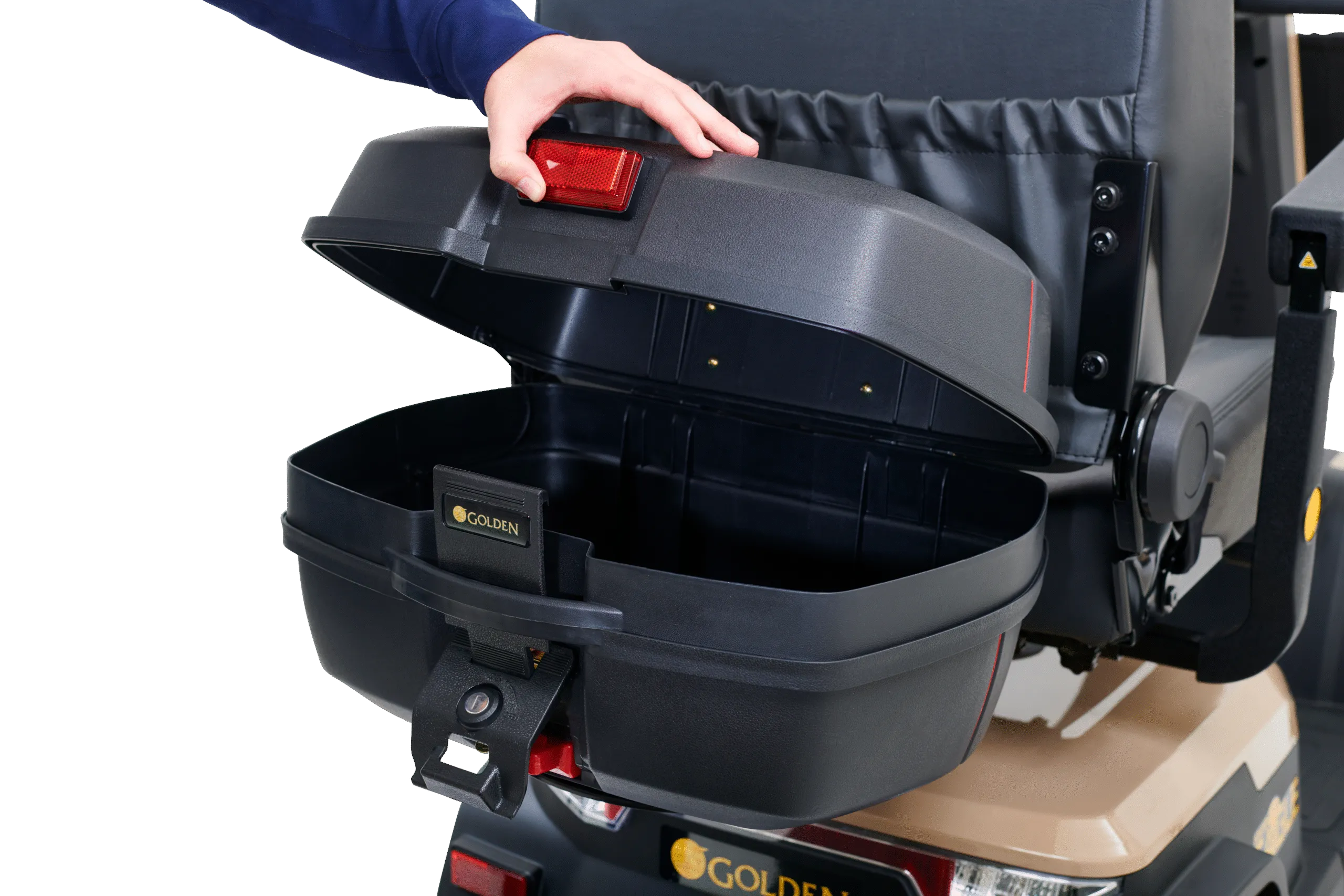 Lockable, water-resistant rear storage compartment