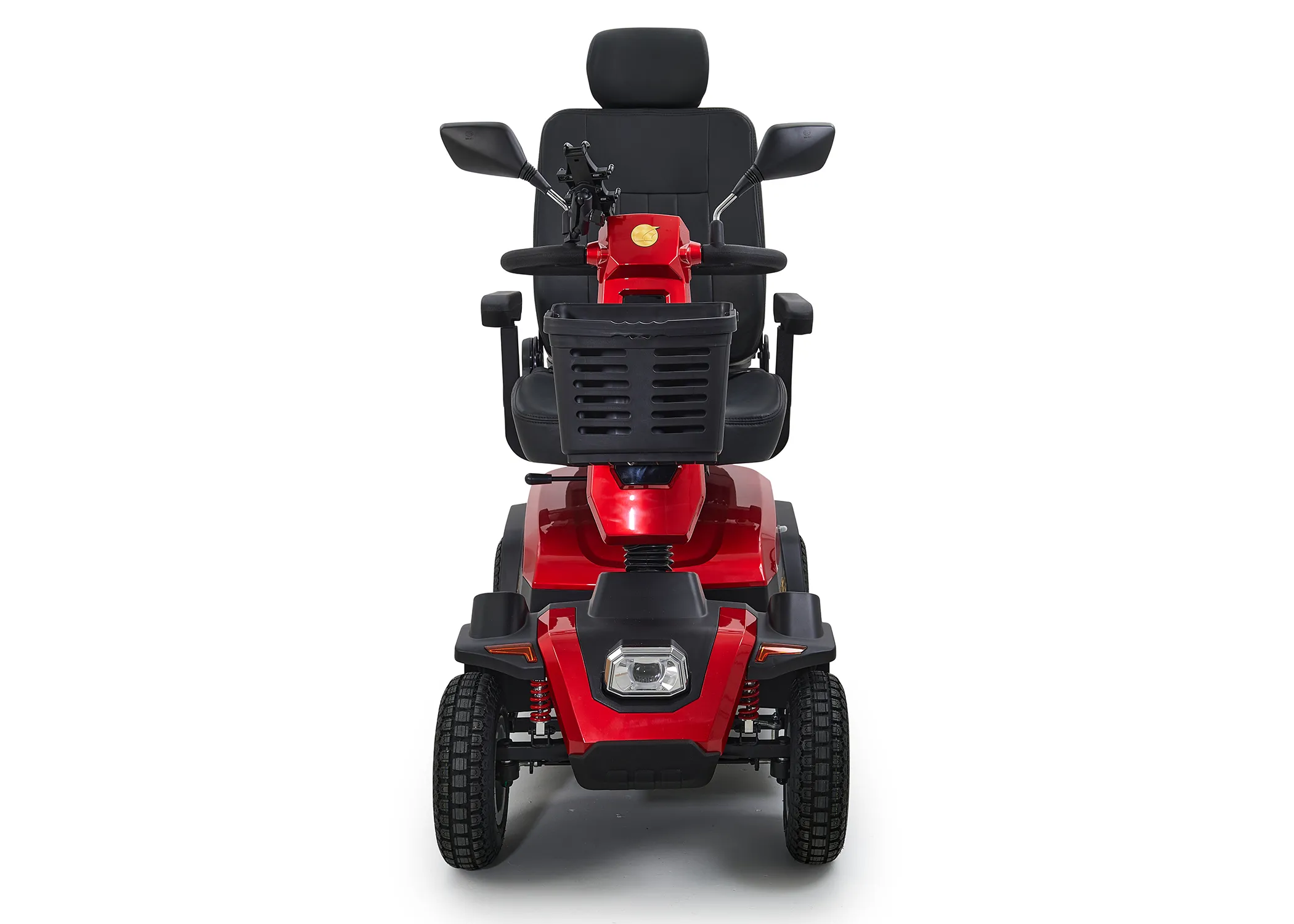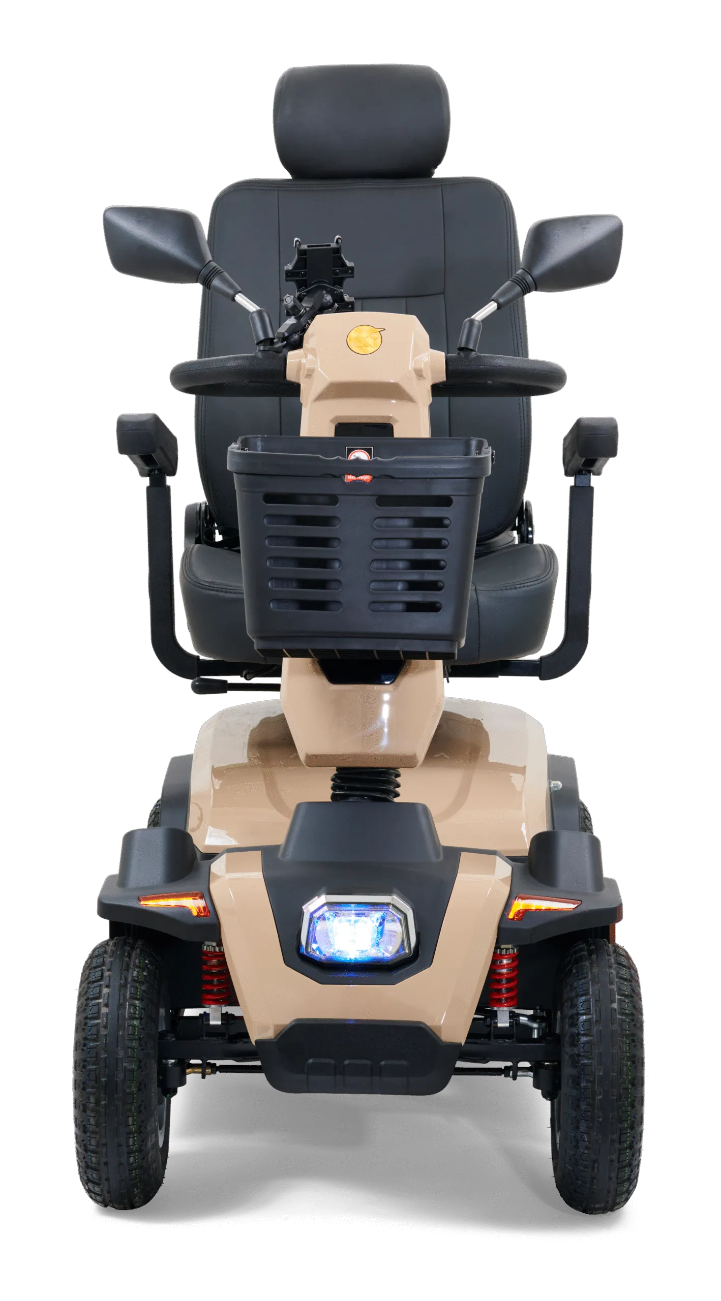 Equipped with a powerful 140 Amp controller, full front and rear suspension, and 13” pneumatic tires, this scooter delivers outstanding traction and a comfortable ride across rough surfaces. The luxury high-back Captain’s seat with swivel functionality ensures ergonomic support, while the gas-adjustable tiller allows for a tailored driving experience.